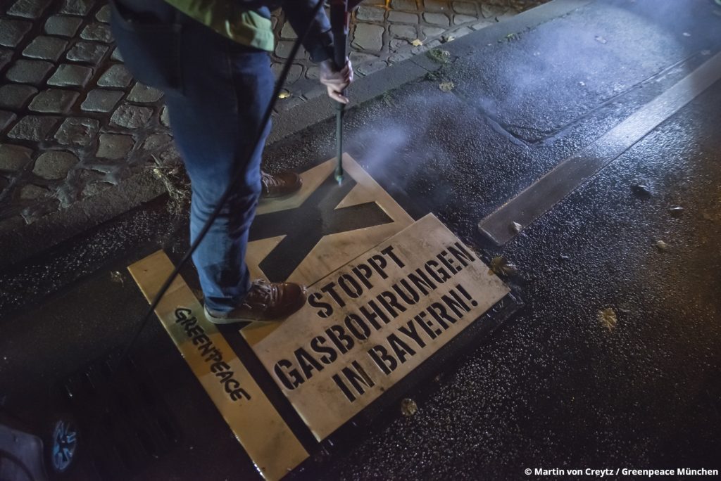 Am Samstag waren wir unterwegs um gegen Gasbohrungen in Bayern zu protestieren. Mit Schablonen und Hochdruckreinigern haben wir sogenannte „Clean Graffitis“ auf dem Boden aufgebracht. Die gereinigten Stellen sind unter anderem vor dem Landtag, am Gärtnerplatz und am Odeonsplatz zu finden und zeigen jetzt Slogans wie „Kein neues Gas“ und „Stoppt Gasbohrungen in Bayern“.
