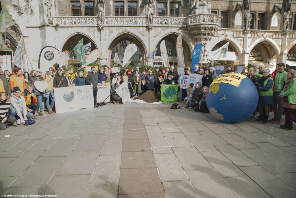 Übergeben wurden die Forderungen von einem verkleideten Münchner Kindl, das zuvor mit einer Gruppe von Klimaaktivist:innen zum Lied „Staying Alive“ getanzt hatte. Auch die aufblasbare Erde von Greenpeace München war als Verdeutlichung dabei – denn letztenendes geht es auch bei dieser Wahl um den Erhalt unserer Lebensgrundlagen auf diesem blauen Planeten.