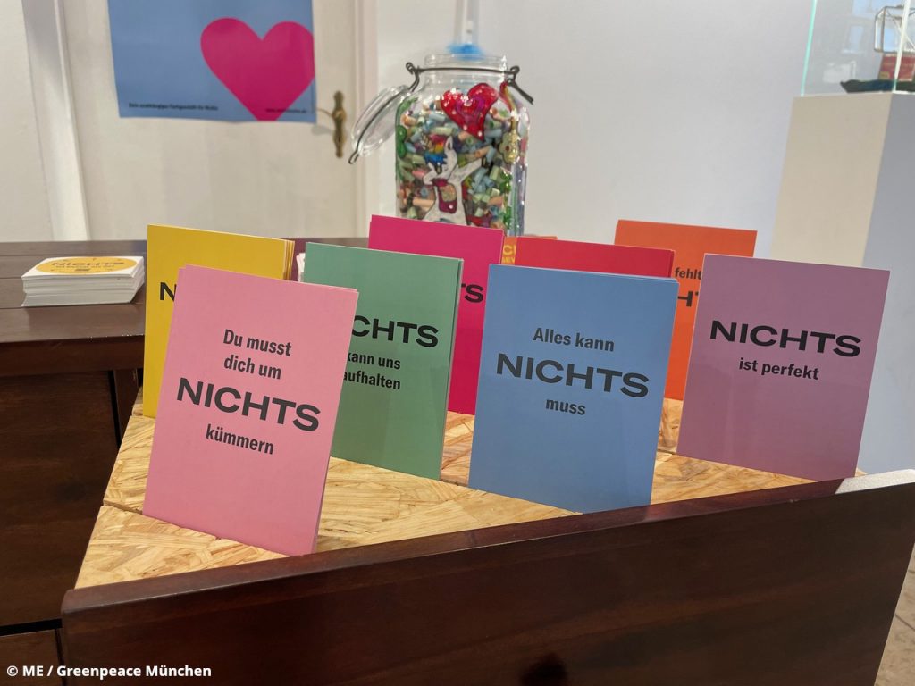 Der Laden wirkt auch weit über das Westend nach München hinein. Blickt man in den drei Wochen aus S-Bahn-Fenstern, entdeckt man große Plakate, die “NICHTS” bewerben. Betritt man die Stadtbibliotheken leuchten einem die bunten Postkarten mit den spritzigen Sprüchen, wie zum Beispiel “NICHTS kann uns aufhalten” entgegen. Und man trifft Ehrenamtliche von Greenpeace München, die den NICHTS Laden in der Sendlingerstraße (einer der Einkaufsstraßen schlechthin) und auf dem Tollwood Festival bewerben. Auch die Resonanz in der Presse war groß. So gab es Beiträge im Radio, Fernsehen (BR24, 20.11.2024 um 18:30 Uhr) und in der Tageszeitung (Artikel in der Süddeutschen Zeitung leider hinter einer Paywall).