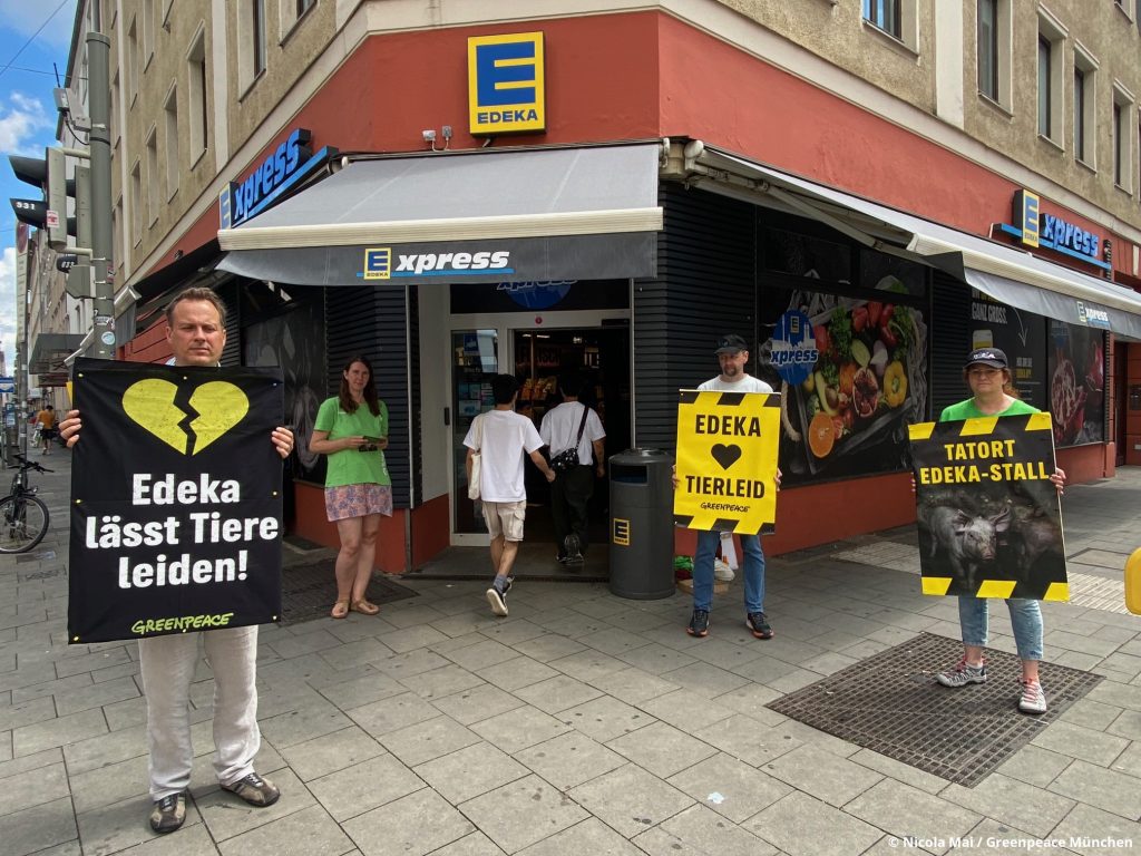 Seit Wochen demonstrieren Aktivist:innen von Greenpeace in ganz Deutschland gegen Edekas tierquälerisches und klimaschädliches Fleischgeschäft. Edeka wirbt mit Liebe zu Lebensmitteln und Klimaschutz, doch der Großteil des Fleischs stammt von Tieren, die unter schlechten Haltungsbedingungen leiden und tierschutzwidrig gehalten werden. Das belegen Bilder aus Edeka-Ställen und ein von Greenpeace beauftragtes Rechtsgutachten.