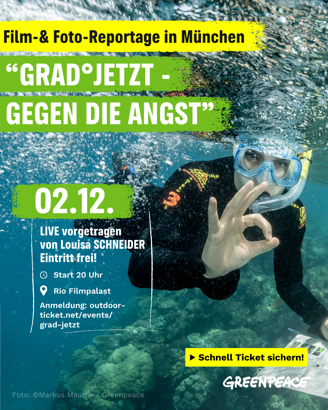 Der Eintritt ist frei, aber eine Ticketbuchung im Voraus ist notwendig. Für das Ticketsystem fällt eine kleine Servicegebühr von 2,50 € an. Hier geht’s zur Anmeldung: https://outdoor-ticket.net/tickets/details/greenpeace-2025-grad-jetzt-louisa-schneider-rio-filmpalast-2025-12-02-20-00/